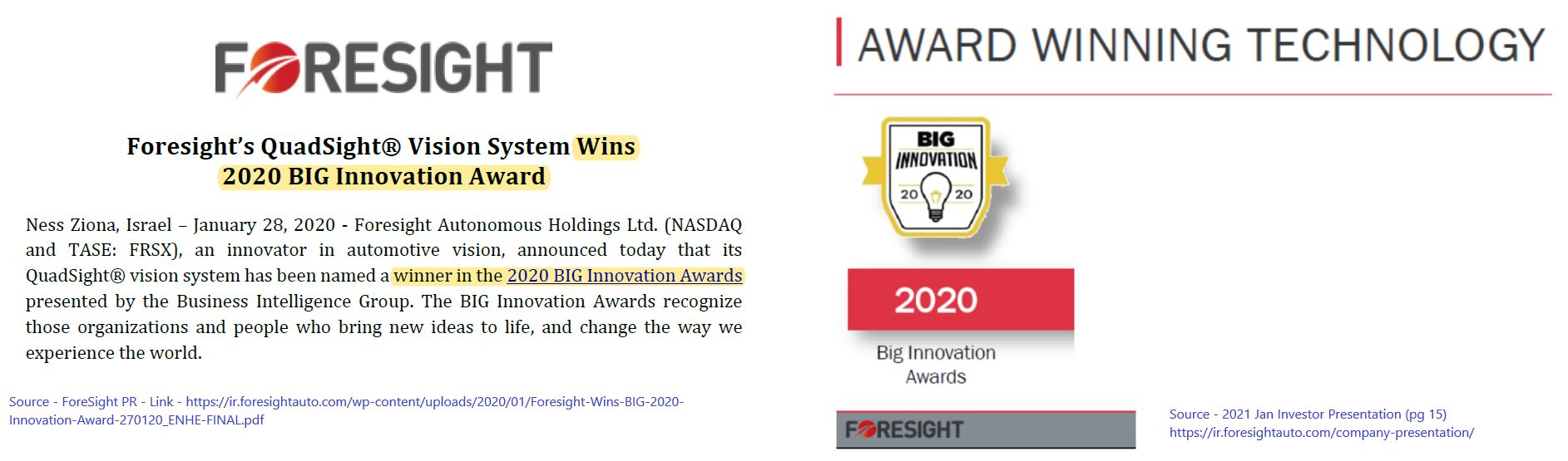 Foresight proudly display QuadSight winning a “Big Innovation Award” in press releases and investor presentations.
