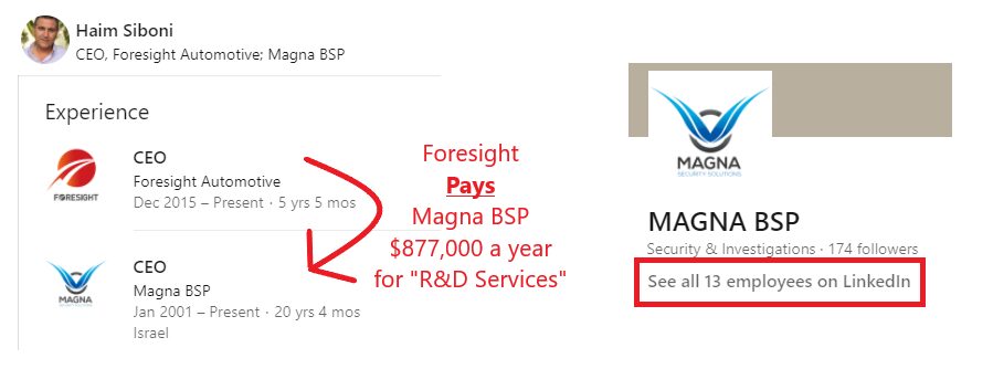 Magna B.S.P. is controlled and run by FRSX current CEO, Haim Siboni (LinkedIn) and Haim’s Brother-in-Law Levy Zruya (LinkedIn). Magna owns 11.1% of FRSX’s shares.