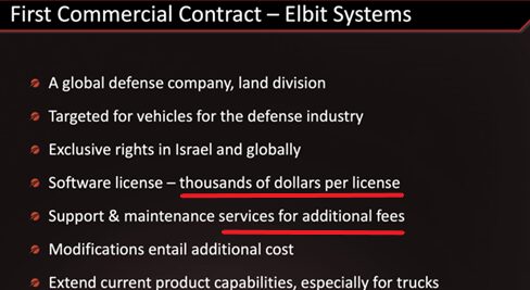 In 2019, FRSX signed a sales agreement with Elbit and it was described as FRSX’s first commercial agreement. FRSX’s IR deck below highlights “thousands of dollars per license” and support & maintenance services as incremental revenue.