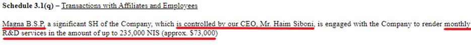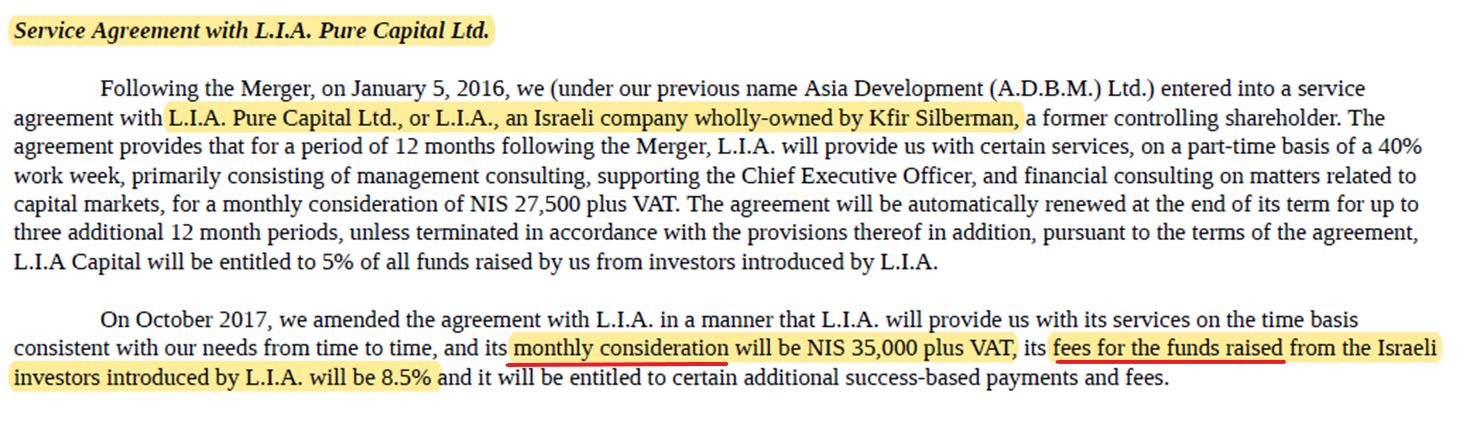 - Monthly Payments –Silberman (via Pure Capital) also receives 35,000 NIS a month so ~$125,000 a year since 2017 (2019 20-f pg 57). This was also increased in 2016 from NIS 27,500 at the time of the merger. See Appendix for full excerpt of agreement.