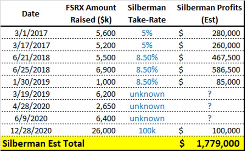- Round-trip financing – shareholder capital is paid out to a party connected to Silberman – then a smaller amount is funneled back to FRSX through new financings (minus a % fee?).